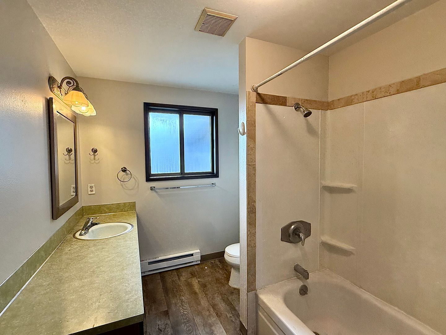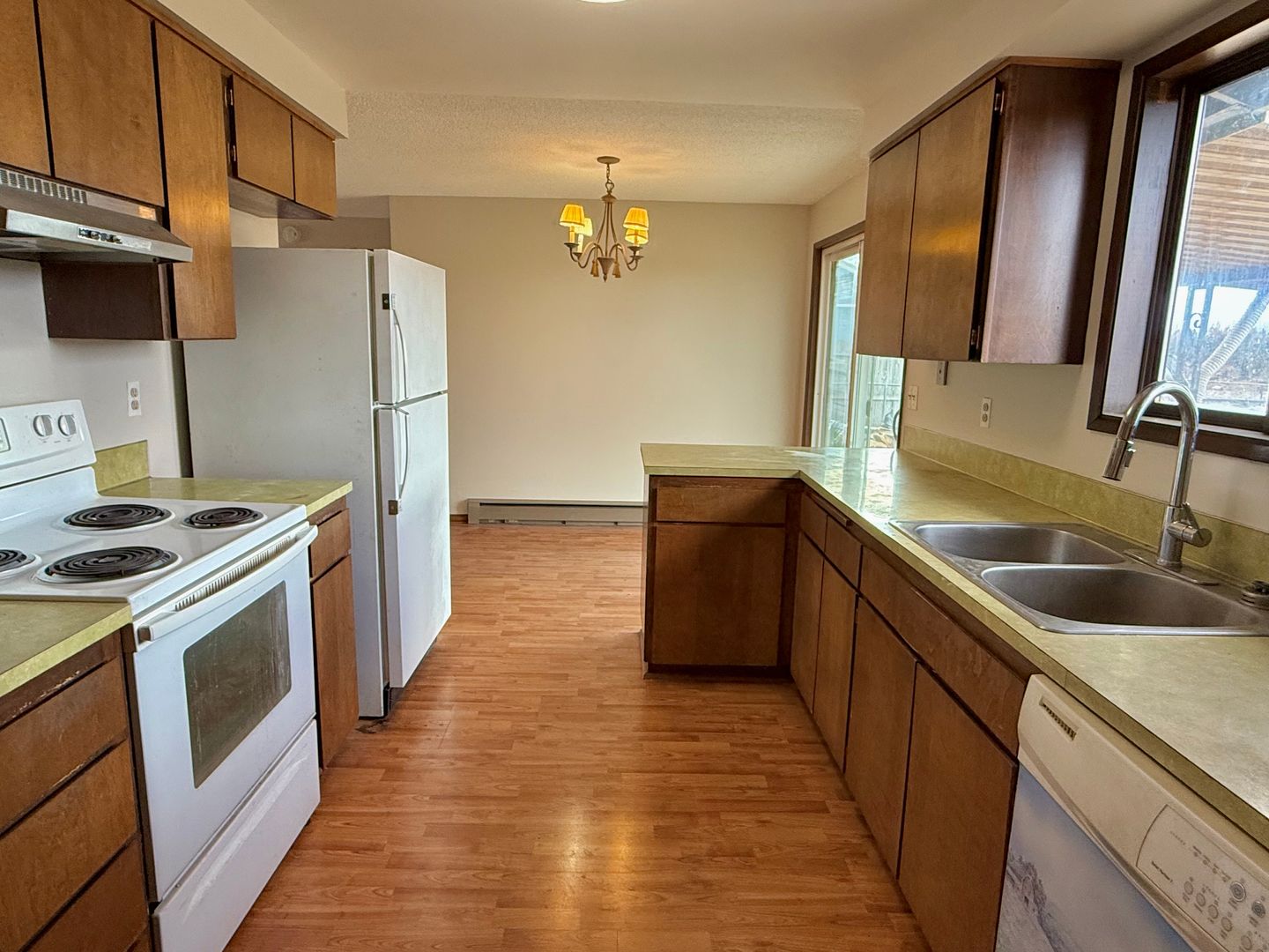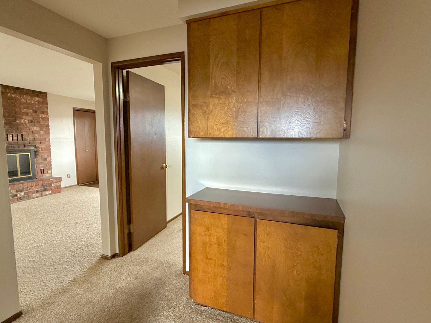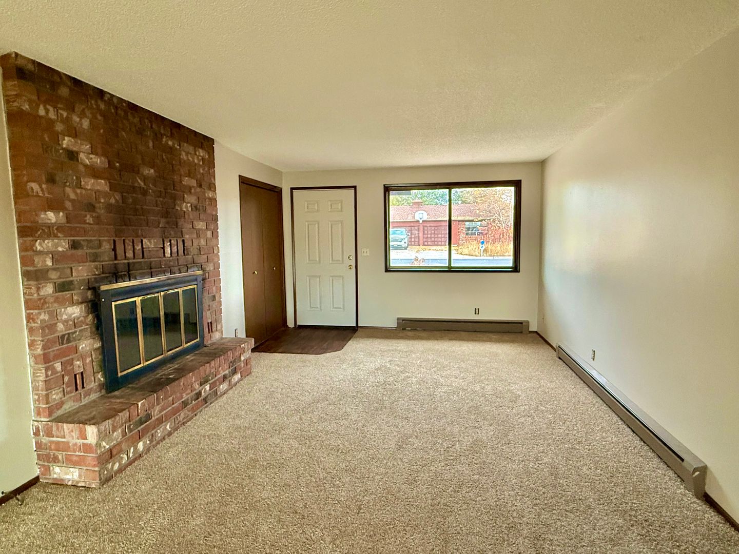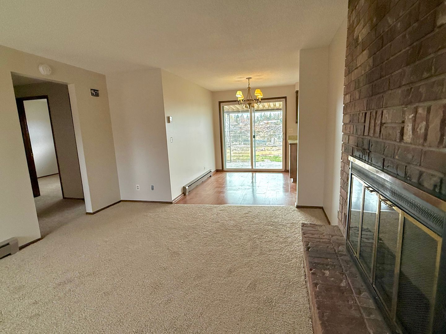 This cozy 2-bedroom, 1-bath duplex has been refreshed with new flooring and paint throughout. The living room features a charming brick fireplace, and the dining area opens to a covered patio through a sliding glass door.