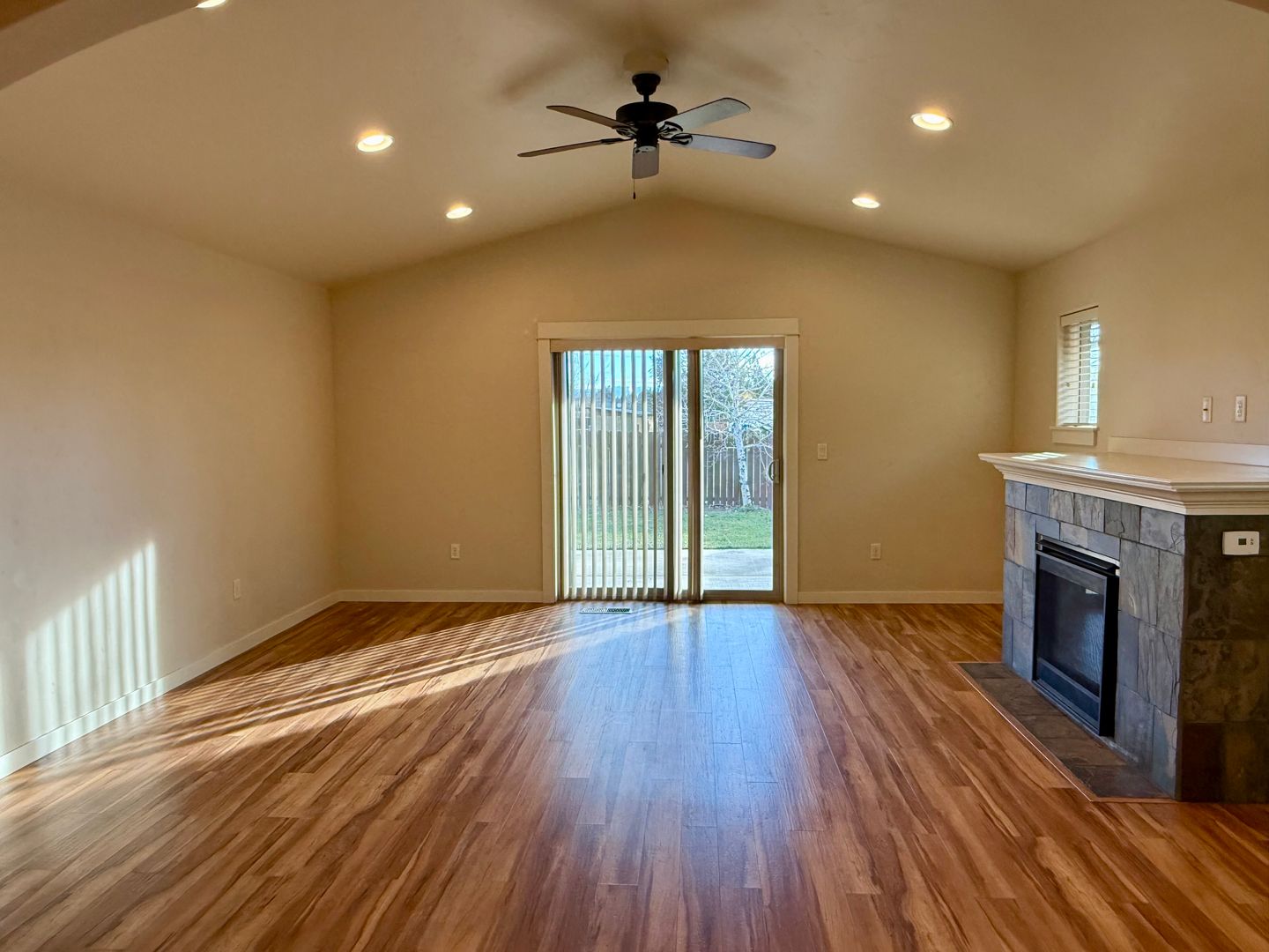 This spacious 4-bedroom, 2-bath home is tucked into a great Bend location, less than a 10-minute drive to downtown and the Old Mill District. The updated kitchen includes a large island, pantry, and breakfast bar seating, and flows easily into the dining and living areas, making the space feel open and connected. A gas fireplace adds cozy charm, especially on winter days when you can watch the snow fall through the sliding glass door leading out to the fully fenced backyard and covered patio.